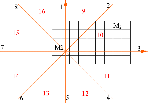 Il s’agit de diviser l’écran en 8 portions, définis selon les horizontales, les verticales et les diagonales, lesquelles se coupent toutes au centre du pixel M1; Elles définissent ainsi un repère et dessinent 16 régions (on distingue les demi_droites et les portions de plan). M2 se trouve donc dans une de ces 16 régions annotées sur le schéma suivant :