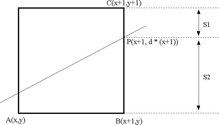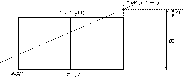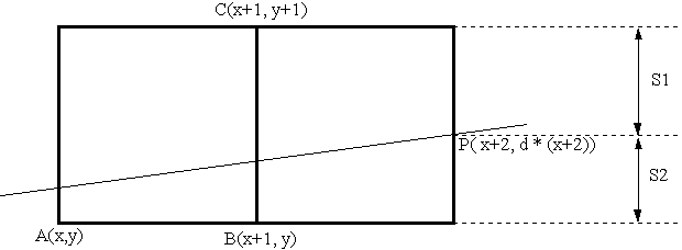 Le choix entre B et C s’effectue en fonction de la position du point P(x+1, d * (x +1)) par rapport au centre du segment [BC], c’est à dire en fonction du signe de : | S(a) | = S1 - S2 |